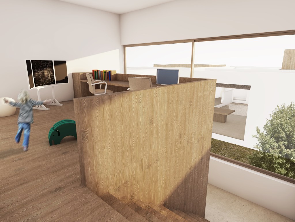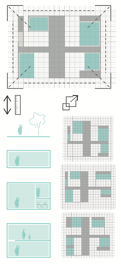 La vivienda se ha configurado partiendo de una retícula tanto en planta como en altura de 1,5 metros (subdivido en 0,5m) puesto que esta es una medida que facilita la configu- ración de elementos fácilmente transportables en camiones. Esto además permite que la planta sea ESCALABLE y pueda adaptarse, así, a las distintas condiciones de las necesida- des del usuario.