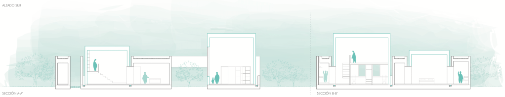 Conceptualmente, la casa se plantea como un soporte de hormigón prefabricado sobre el que se asientan unas cajas funcionales. Este soporte se entiende como una piel que recupera la idea de la casa tradicional andaluza, que articula toda la vivienda en torno a una serie de patios. De este modo la casa presenta un carácter más cerrado hacia el exterior, volcándose toda su actividad hacia el interior.