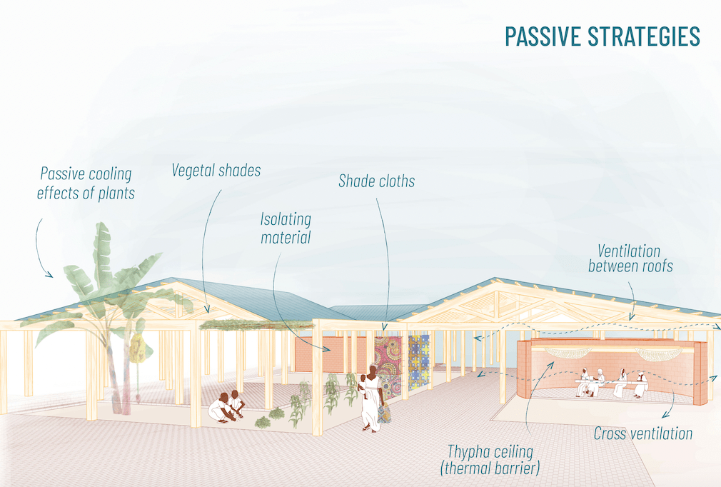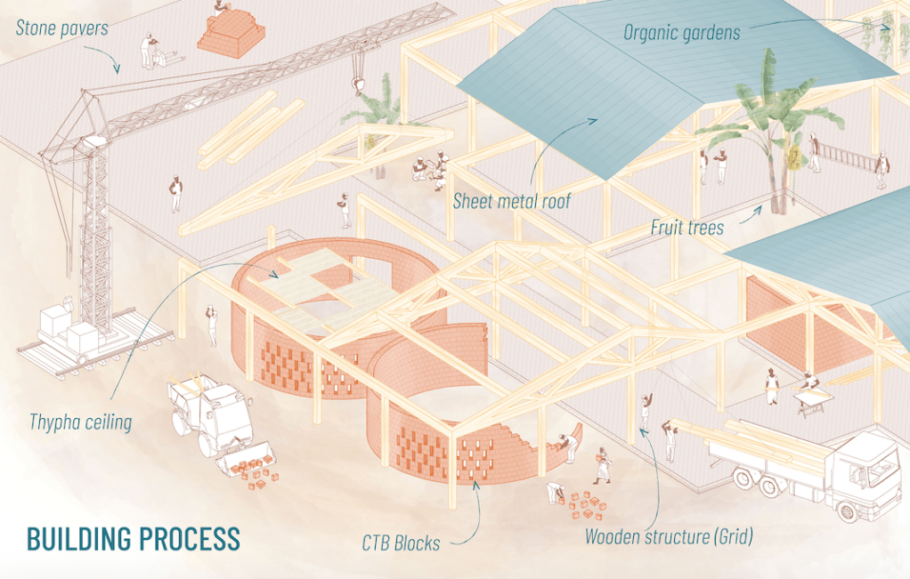 - Las piezas del programa: son edificaciones que solo constan de un perímetro construido. Se usan bloques de tierra comprimida mejorados, estabilizados con cemento y reforzados con fibras de thypha. El resultado es un material resistente y térmicamente aislante. Estos espacios se pueden cubrir con tejidos de thypha para mejorar sus propiedades ambientales.